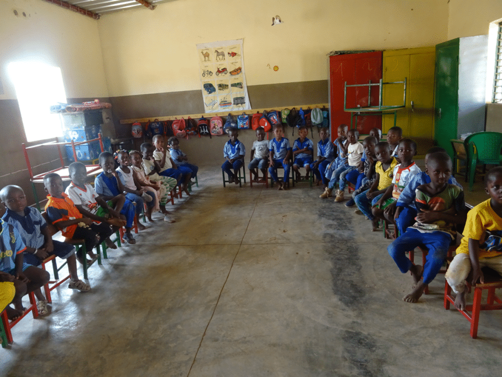 Een eerste project richt zich tot 120 peuters en kleuters op. We bouwden daarvoor een school met 3 ruime klaslokalen : “petite section” (driejarigen), “moyenne section (vierjarigen) en “grande section” (vijfjarigen). Het is een “bisongo” ( Het is een school die geïntegreerd is in de dorpsgemeenschap. Zulke school is gemeenschapsgericht, het biedt de kinderen gemakkelijker toegang tot het basisonderwijs. Het programma is afgestemd op de lokale cultuur en tradities. Door kinderen een veilige plek te bieden, maken “bisongo’s” het mogelijk voor vrouwen om buitenshuis te werken en een bijdrage te leveren tot het gezinsinkomen.